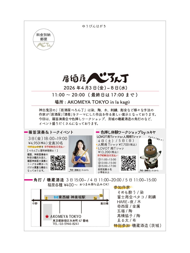 今回は、篠笛演奏会や色挿しワークショップ、茨城の磯蔵酒造の角打のなど、イベント盛りだくさんになっております。